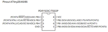 ATtiny85 | ![]() | 10 6(K) 4(G) | Parametrics Name Value Program Memory Type Flash Program Memory Size (KB) 8 CPU Speed (MIPS/DMIPS) 20 SRAM Bytes 512 Data EEPROM/HEF (bytes) 512 Digital Communication Peripherals 1-SPI, 1-I2C Capture/Compare/PWM Peripherals 5 PWM Timers 2 x 8-bit Number of Comparators 1 Temperature Range (C) -40 to 85 Operating Voltage Range (V) 1.8 to 5.5 Pin Count 8 ![]() |